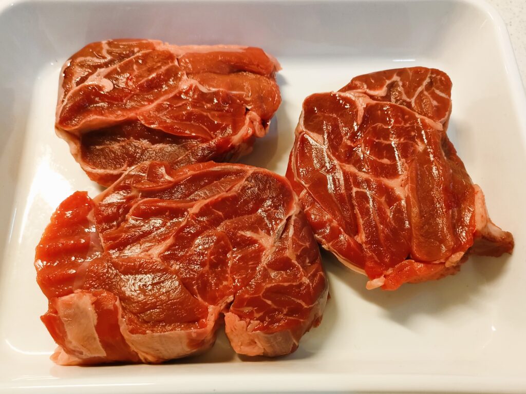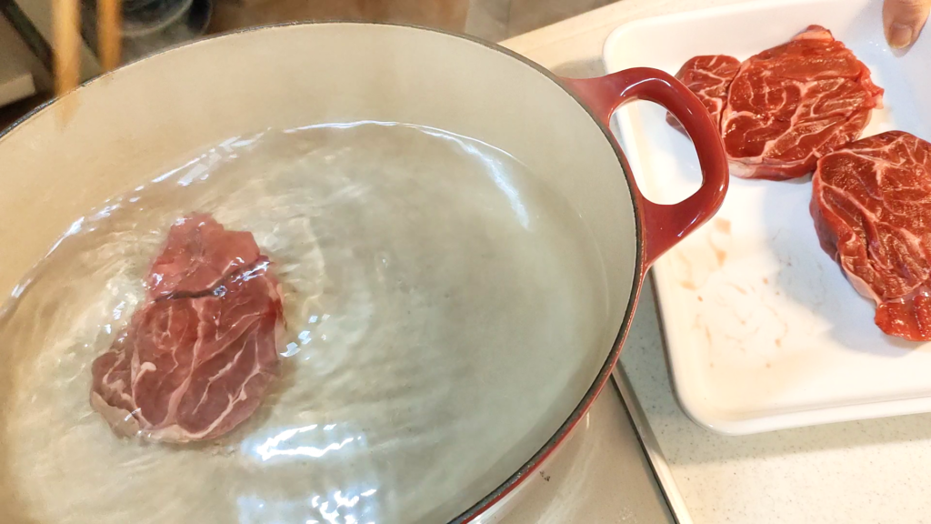 1.牛スネ肉は、沸かした湯に入れて1分下ゆでする。
