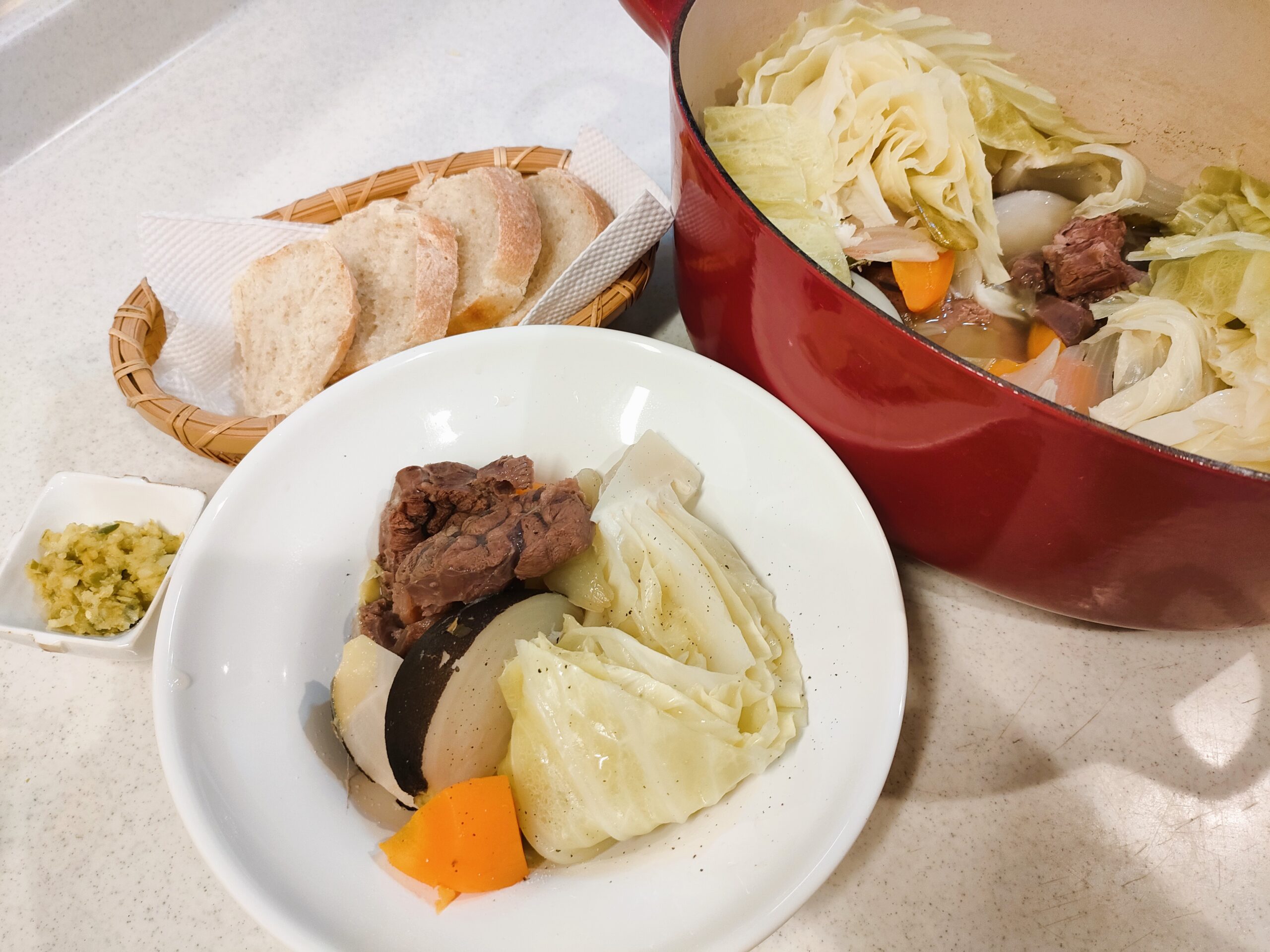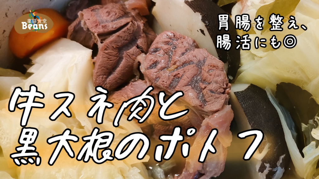 牛スネ肉の旨味を含んだ野菜が美味しいポトフ。牛肉は胃腸を健やかにする良質たんぱく源。黒大根は実が緻密で固く、煮崩れしないので煮物に最適。煮ると甘みが増してホックリ、食べ応えがあります。たっぷりの野菜が腸活に貢献。