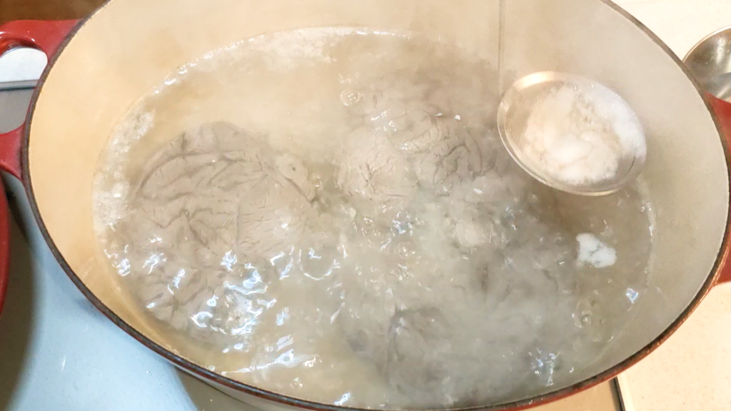 2.鍋に水1.5リットルを入れ、湯をきった牛スネ肉を入れ、塩を加えて煮始める。煮立ってきたら、あくをすくい取り、弱火にし、蓋をずらしてのせ、60分煮る。