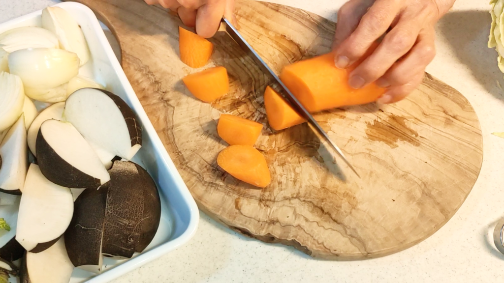 3.野菜を切る。黒大根は両端を切り、8つのくし形に切る。ニンジンは皮むき器で表面を薄く削り取り、一口大の乱切りにする。玉葱は皮をむき、根元をつけた状態で6つのくし形の切る。キャベツは太い芯をつけた状態で4つにのくし形に切る。