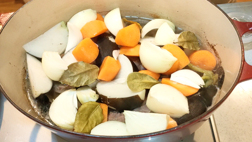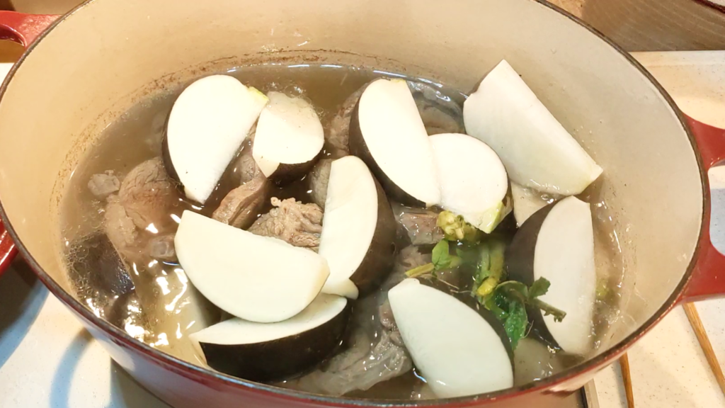 4.牛スネ肉を60分煮たところに、黒大根を入れ、蓋ずらしてのせ、弱火で20分煮る。