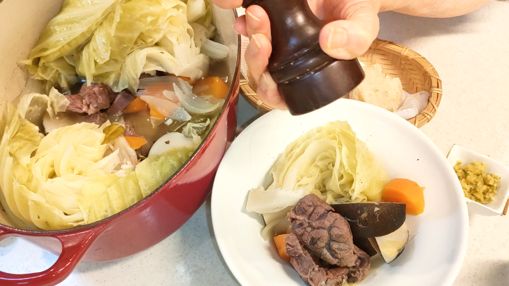 7.牛スネ肉、黒大根、キャベツは、それぞれ食べやすいサイズに切り分けて器に盛り、煮汁を適宜かける。好みで、柚子胡椒、粒マスタードなどを薬味に添えるとよい。パンにも、ご飯にも合う。