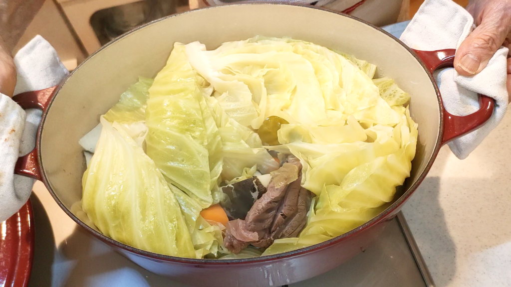 5.ニンジン、玉葱、バイマクルーを散らし、キャベツを加え、蓋をして、野菜が柔らかくなるまで、さらに20分煮る。
