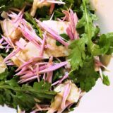 4.春菊の茎を先に入れて軽く炒め、塩を振り、残りの春菊を加えて炒める。手早く炒め、色よく、歯ごたえよく仕上げる。