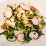 皿に盛り、春菊とエリンギの塩炒めを付け合わせる。