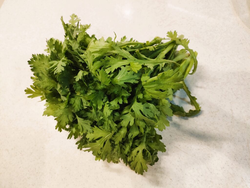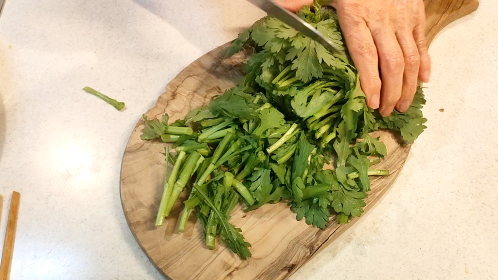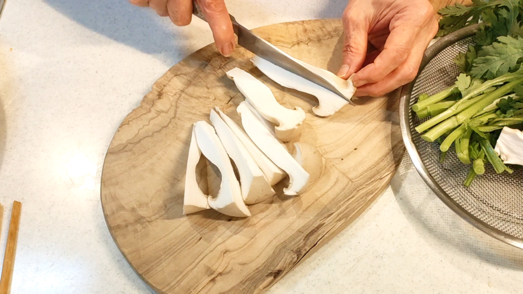 2.春菊は茎の固い部分を除き、3㎝長さに切る。干したエリンギは長ければ半分に切る。