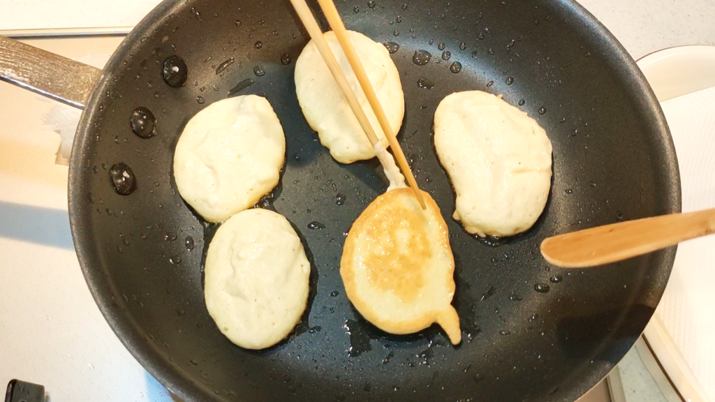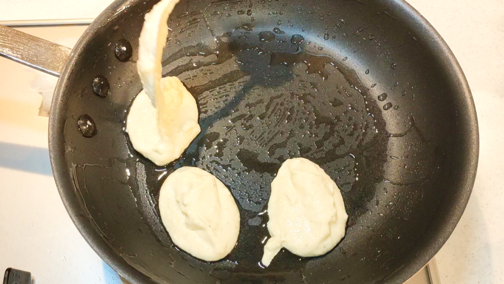 5.フライパンに油を薄くひき、中火弱で温める。4の生地を大さじ山盛り一杯ずつ落とし入れる。