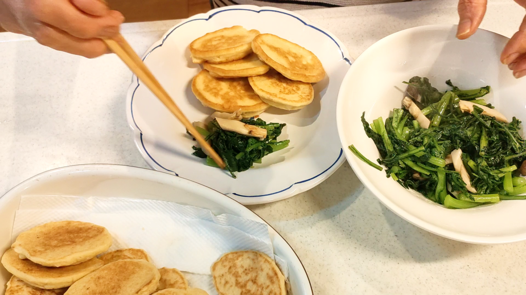 豆腐、山芋,卵をミキサーでピュレ状にし、一口大に焼きます。ふわとろ食感で、やさしい味わい、軽い食事代わり、子供のおやつにもお勧めです。豆腐は大豆由来の良いタンパク質源。山芋と卵が体液を補って潤し、乾燥による肌のかさつき、から咳、声がれを予防。肝機能を正常にする春菊を添え、春先に負担が増す肝をまもりましょう。