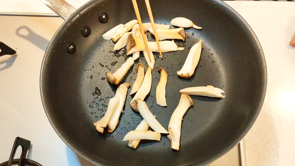 3.フライパンに油を入れて中火弱に点火し、エリンギを軽く炒める。水大さじ2を加えてしんなりさせる。